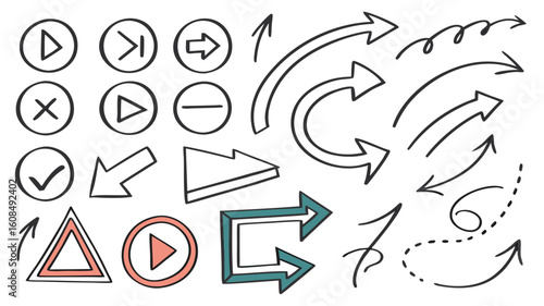 Vector collection of hand drawn arrows and symbols including play buttons check marks and directional indicators