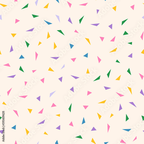 Vector abstract minimalist geometric texture with small colorful triangles, pink, blue, lilac, yellow, green. Funky modern seamless pattern. Simple cute minimal background. Repeat decorative design