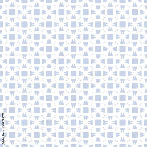 Vector abstract seamless pattern. Elegant floral geometric grid texture. Subtle light blue and white background with flowers, stars, squares, triangles. Repeating design for decor, wallpaper, textile