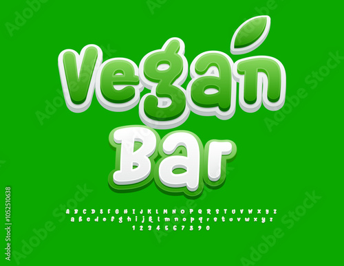 Vector advertising poster Vegan Bar. Creative white and Green Font. Funny Bright Alphabet Letters and Numbers set.