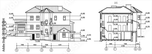 Vector architectural engineering construction drawing of private residential building with dimensional lines. Industrial hand design on white sheet of paper. Blueprint of multistory suburban cottage.