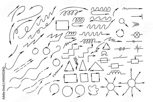 Vector arrows symbol doodle on different shapes and variation graphic sketch illustration. Simple line art of curve, for business projects and education