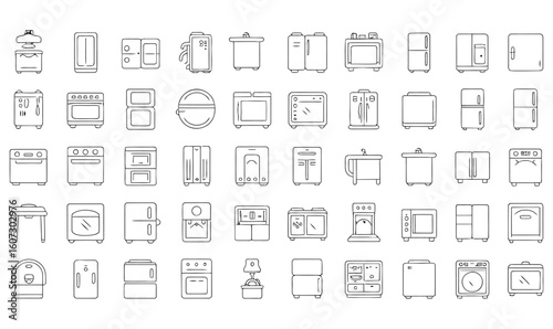 Vector art of a collection of kitchen appliance icons featuring ovens, refrigerators, and other home equipment, isolated on white background