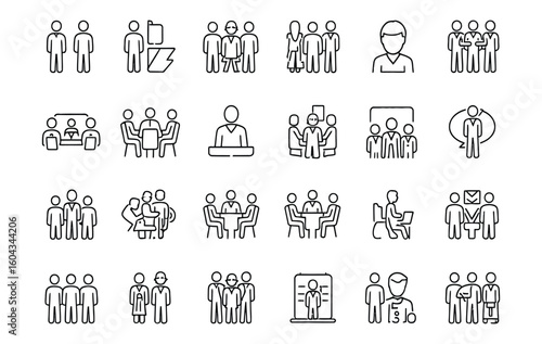 Vector art of a collection of line art icons depicting groups of people in various business and social settings on a white background