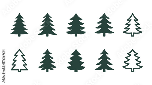 Vector art of a collection of ten stylized christmas trees in various green shades and outlines