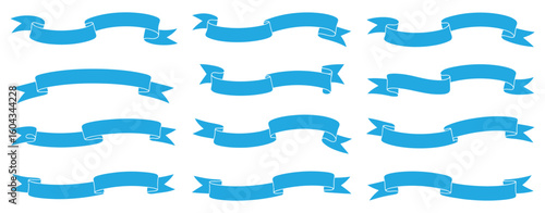 Vector art of a collection of twelve blue banner illustrations in various shapes and sizes on a white background