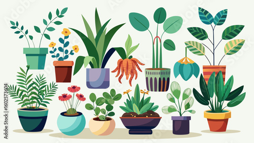 Vector art of a diverse collection of potted houseplants with various leaves and flowers arranged in different pots isolated on a white background