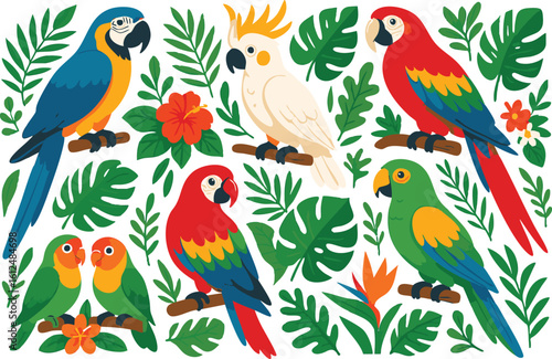 Vector art of a lively assortment of colorful tropical birds, featuring macaws, a cockatoo, lovebirds, and a toucan amidst lush foliage and flowers isolated on transparent background