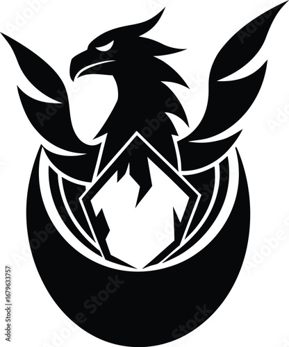 Vector art of a powerful phoenix silhouette rising from a stylized crescent moon or flame, depicted in a bold black and white graphic illustration, isolated on a