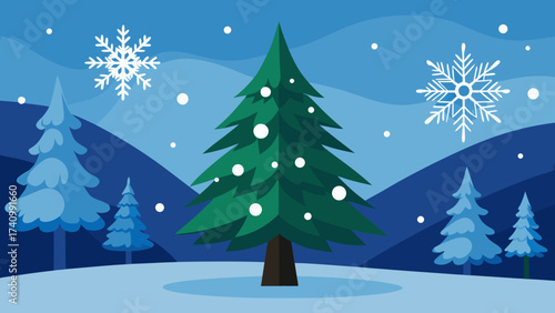 Vector art of a serene winter scene with a christmas tree, snowflakes falling, and a peaceful landscape, creating a joyful holiday atmosphere