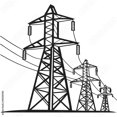 Vector art of a series of high voltage electricity pylons stretching into the distance, delivering power across the land