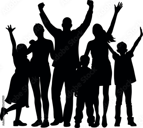 Vector art of a silhouette of a joyful family group with arms raised in celebration, expressing happiness and togetherness