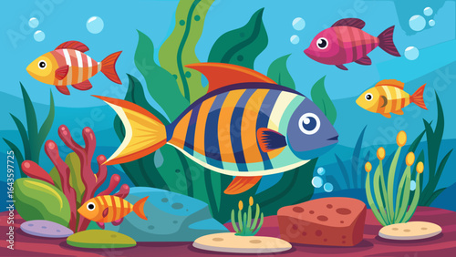 Vector art of an engaging cartoon scene showcasing a school of fish, including a large striped fish and smaller colorful ones, swimming in a lively underwater world