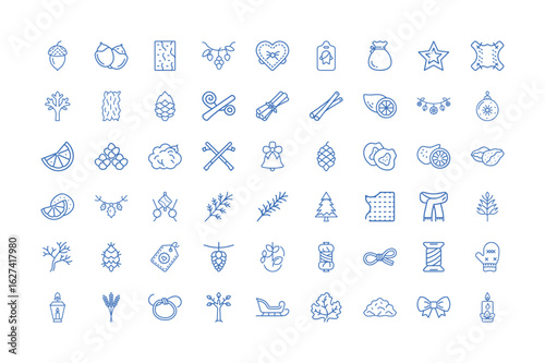 Vector art of assortment of christmas and winter holiday icons, featuring ornaments, gifts, trees, snowflakes, and seasonal elements, isolated on white background