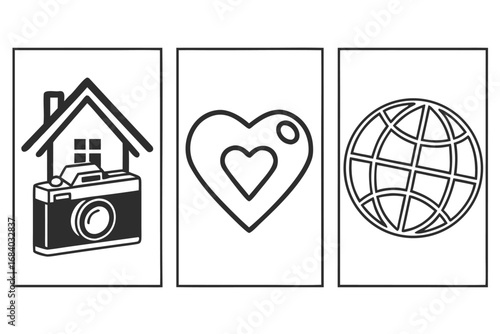 Vector art of black and white icons depicting a camera in front of a house, a heart within a heart, and a globe