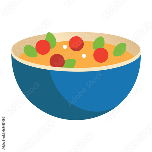 Vector art of bowl of soup with tomatoes and basil isolated on white background