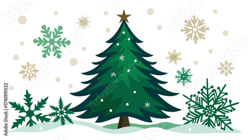 Vector art of christmas tree with snowflakes, a festive scene with snow and holiday spirit, perfect for seasonal greetings