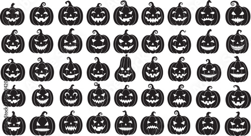 Vector art of collection of black and white carved halloween pumpkins with various spooky faces, isolated on a