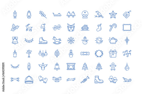 Vector art of collection of christmas and winter holiday icons, including festive elements like gifts, trees, snowmen, reindeer, and decorations, all isolated a for easy use in designs
