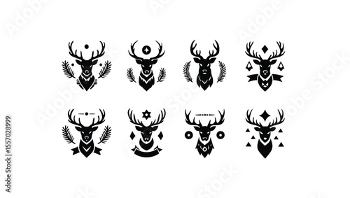 Vector art of collection of eight unique deer head icons isolated on white background, ideal for logo design or wildlife themed projects