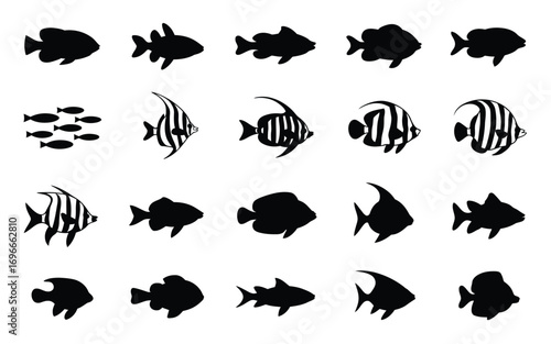 Vector art of collection of fish silhouettes set of different fish species, swimming, schooling vector illustration of marine animals in various positions