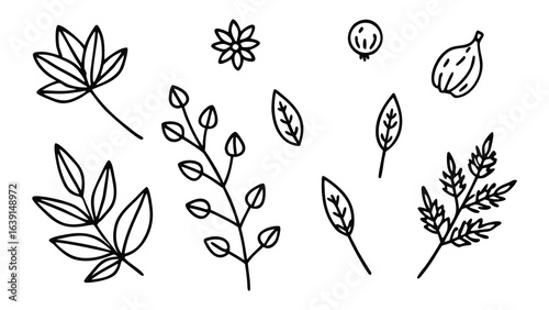 Vector art of collection of handdrawn botanical elements and leaves isolated on a white background, perfect for design and decoration.