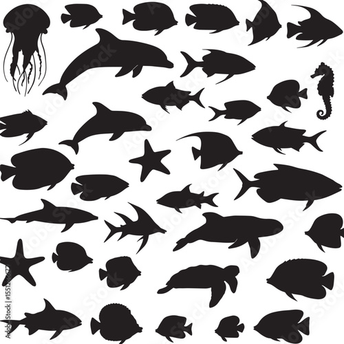 Vector art of collection of various marine animals silhouettes isolated on white background