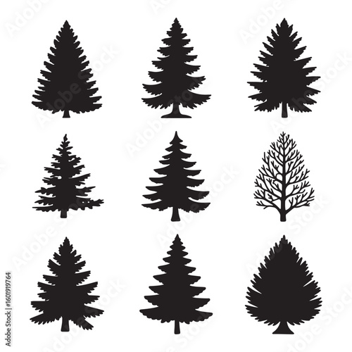 Vector art of collection of various pine tree silhouettes isolated on white background