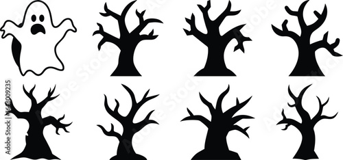 Vector art of ghost and spooky bare trees silhouette icons for halloween isolated on transparent background