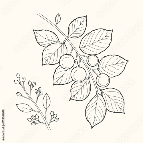 Vector art of handdrawn illustration of cherry branches with leaves and berries, isolated on a light cream background