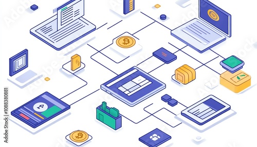 Vector art of interconnected financial technology icons showing online transactions, digital banking, and cryptocurrency solutions