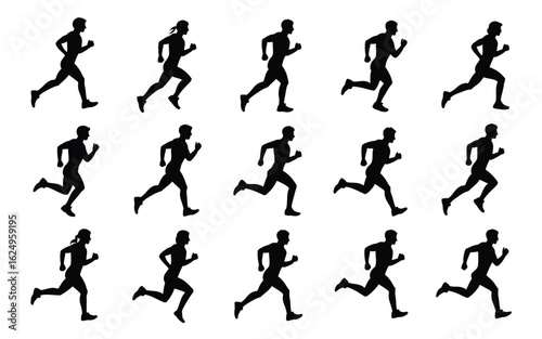 Vector art of set of silhouette runners isolated on white background in various poses and action