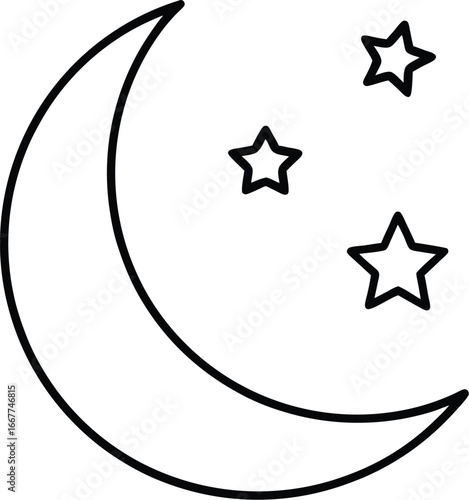 Vector art of simple line drawing of a crescent moon and three stars
