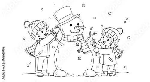 Vector art of two children building a snowman together, placing a hat on its head and adding a scarf
