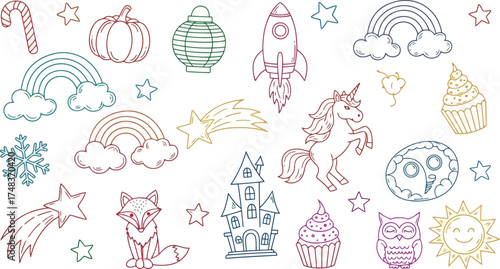Vector art of whimsical doodle collection featuring a rocket, unicorn, fox, and rainbow