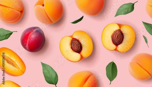 Vector artwork of peach, plum, and apricot slices on a soft pastel pink background.