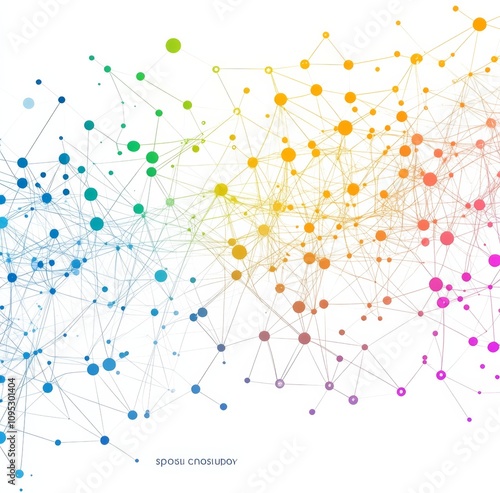 Vector background of interconnected circles and dots representing network connections on a white background, with a colorful palette of light grey, yellow, blue-green, orange, purple, and pink