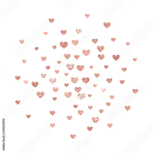 Vector background with rose gold foil confetti hearts isolated on white. Modern element for wedding, celebration, party, anniversary, birthday, Valentine's Day designs.