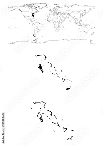 Vector Bahamas map, map of Bahamas showing country location on world with solid and outline maps for Bahamas on white background. File is suitable for digital editing and prints of all sizes.