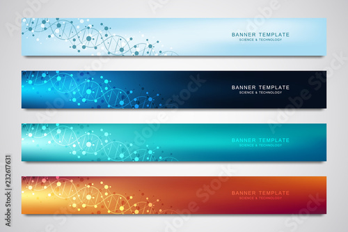 Vector banners and headers for site with DNA strand and molecular structure. Genetic engineering or laboratory research. Abstract geometric texture for medical, science and technology design.