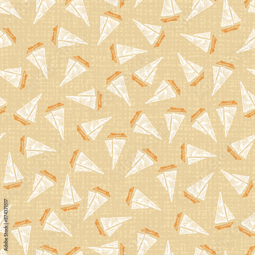 Vector beige multi direction scattered sail boat doodle hand drawn repeat pattern with canvas background. Suitable for gift wrap and wallpaper.