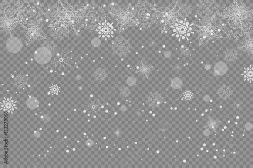Vector blank of transparent snowfall with snowflakes and radiance.