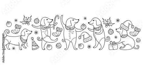 Vector border with outline happy dog in black isolated on white background. Symbol of Chinese New Year 2018 in contour style. Ornate dogs and decoration for winter holiday design and coloring book.