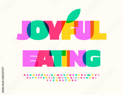 Vector bright logo Joyful Eating. Colorful Alphabet Letters and Numbers set. Modern Artistic Font.