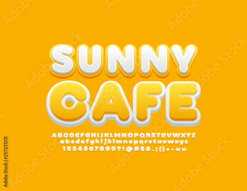 Vector bright logotype Sunny Cafe with Alphabet Letters, Numbers and Symbols. Yellow and White Font for Marketing design