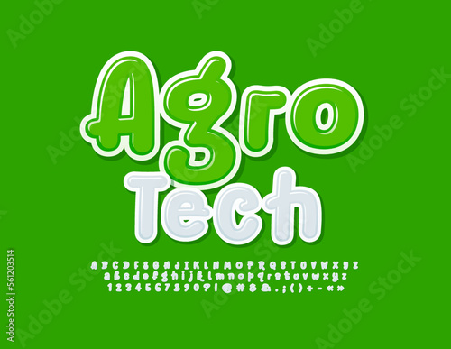 Vector bright poster Agro Tech. Modern handwritten Font. Creative Alphabet Letters, Numbers and Symbols set