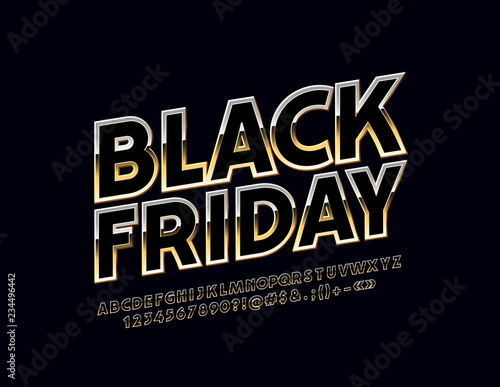 Vector Bright sign Black Friday. Chic Alphabet Letters and Numbers. Elegant Black and Golden Font.