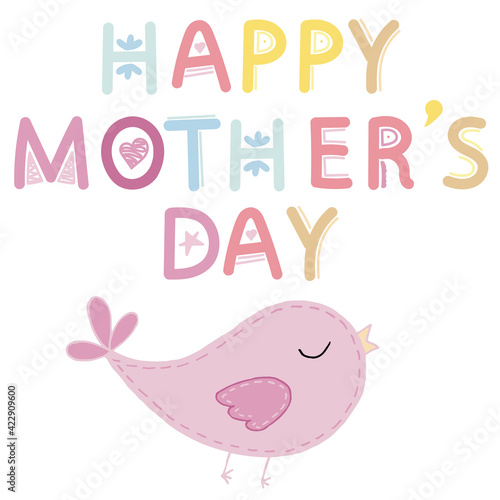 vector card in flat style - happy mothers day, pink cute bird, lettering