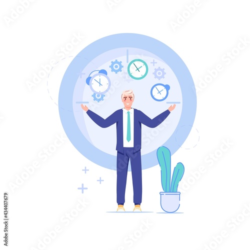 Vector cartoon flat office worker character and big clock.Successful happy employee controls everything,does all works in time-professional workflow,time management,web site banner concept