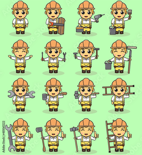 Vector Cartoon illustration of cute Handyman cartoon bundle. Boy Construction Workers with Professional Tools Set. Children's illustration. Flat Cartoon Style.